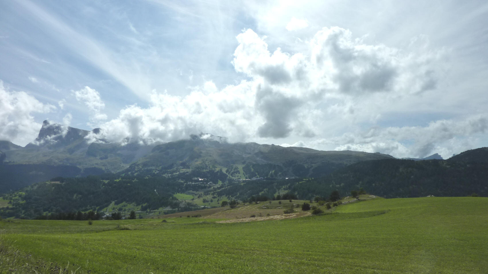 la descente du col du Noyer (1664m) - au loin dans les nuages Superdévoluy