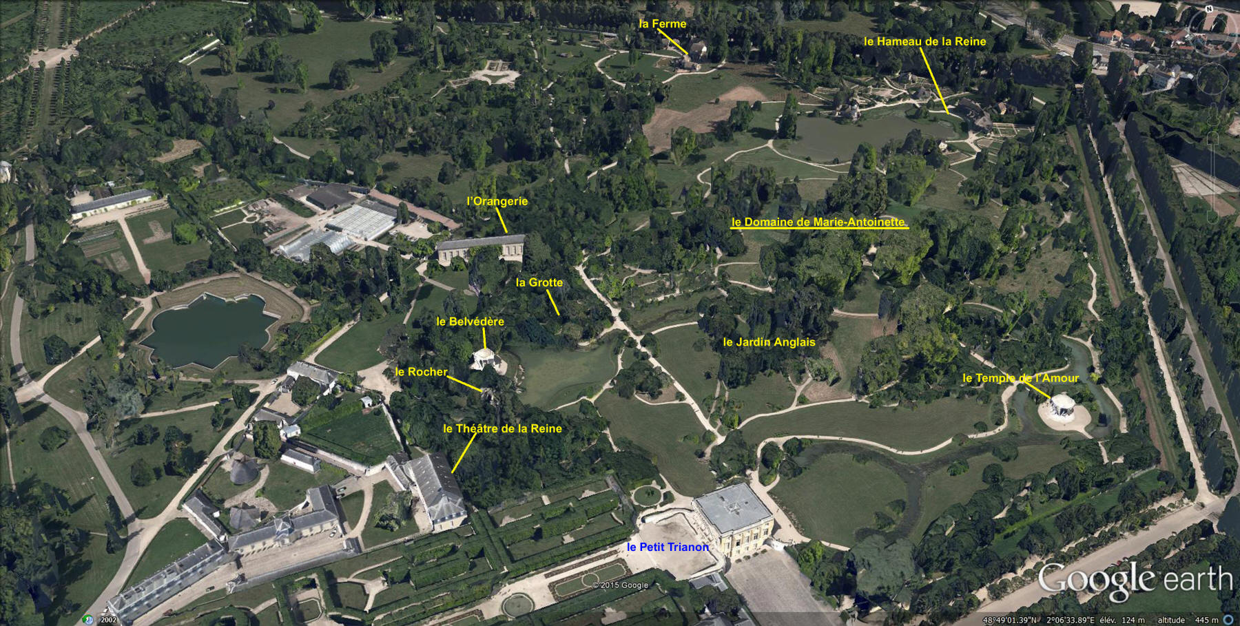 le Domaine de Marie-Antoinette (le Hameau de la Reine - la Ferme - le Temple de l'Amour - l'Orangerie - la Grotte - le Belvédère - le Rocher ......) (copyright Google) (cliquez sur les noms - maj : 28/01/2015)