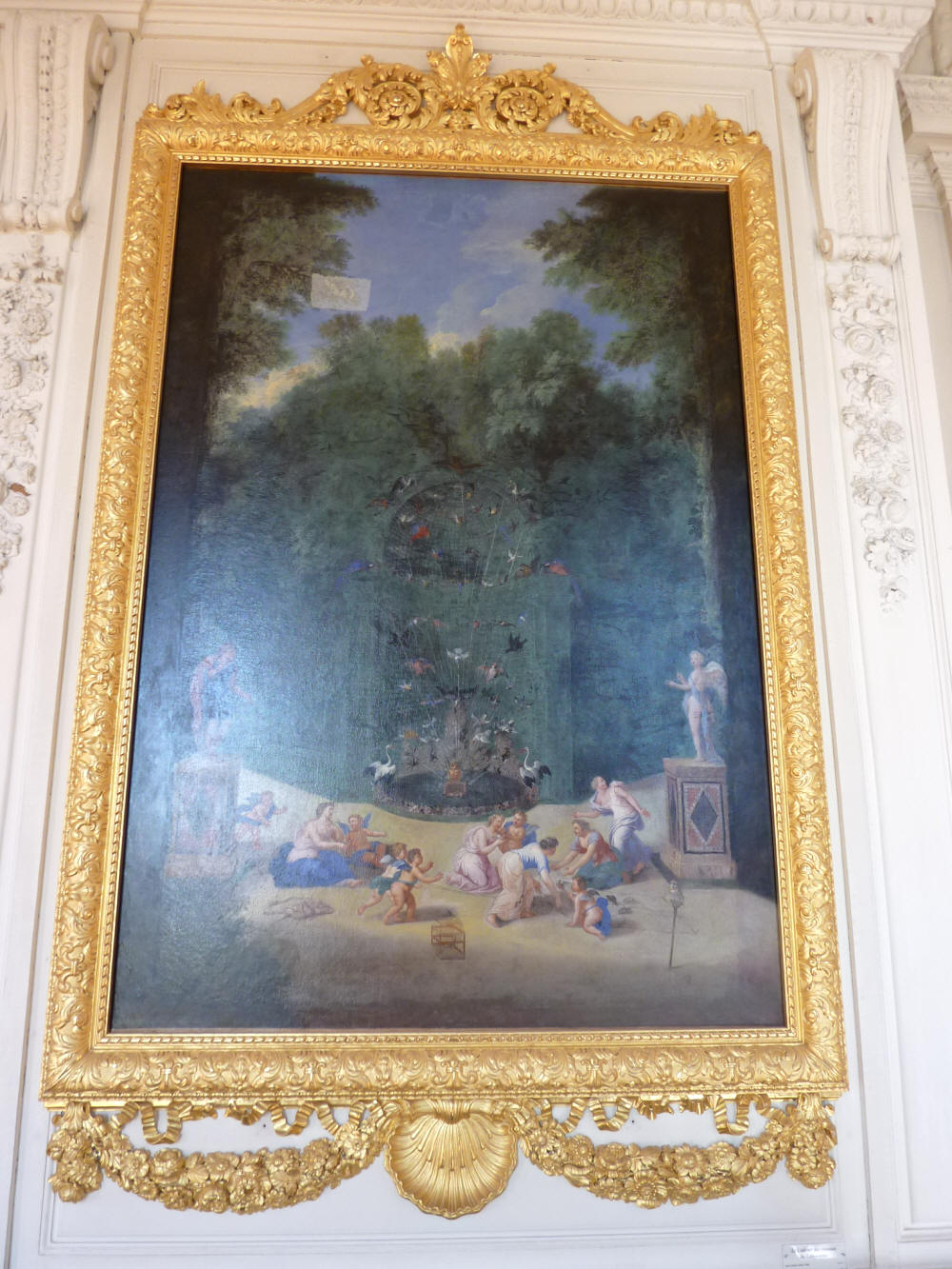 tableau du Bosquet de la Reine - vue de l'entrée du Labyrinthe avec le cabinet des oiseaux, des nymphes et des amours (cliquez sur la photo pour agrandir) Galerie des Cotelle du Grand Trianon le 1er octobre 2015