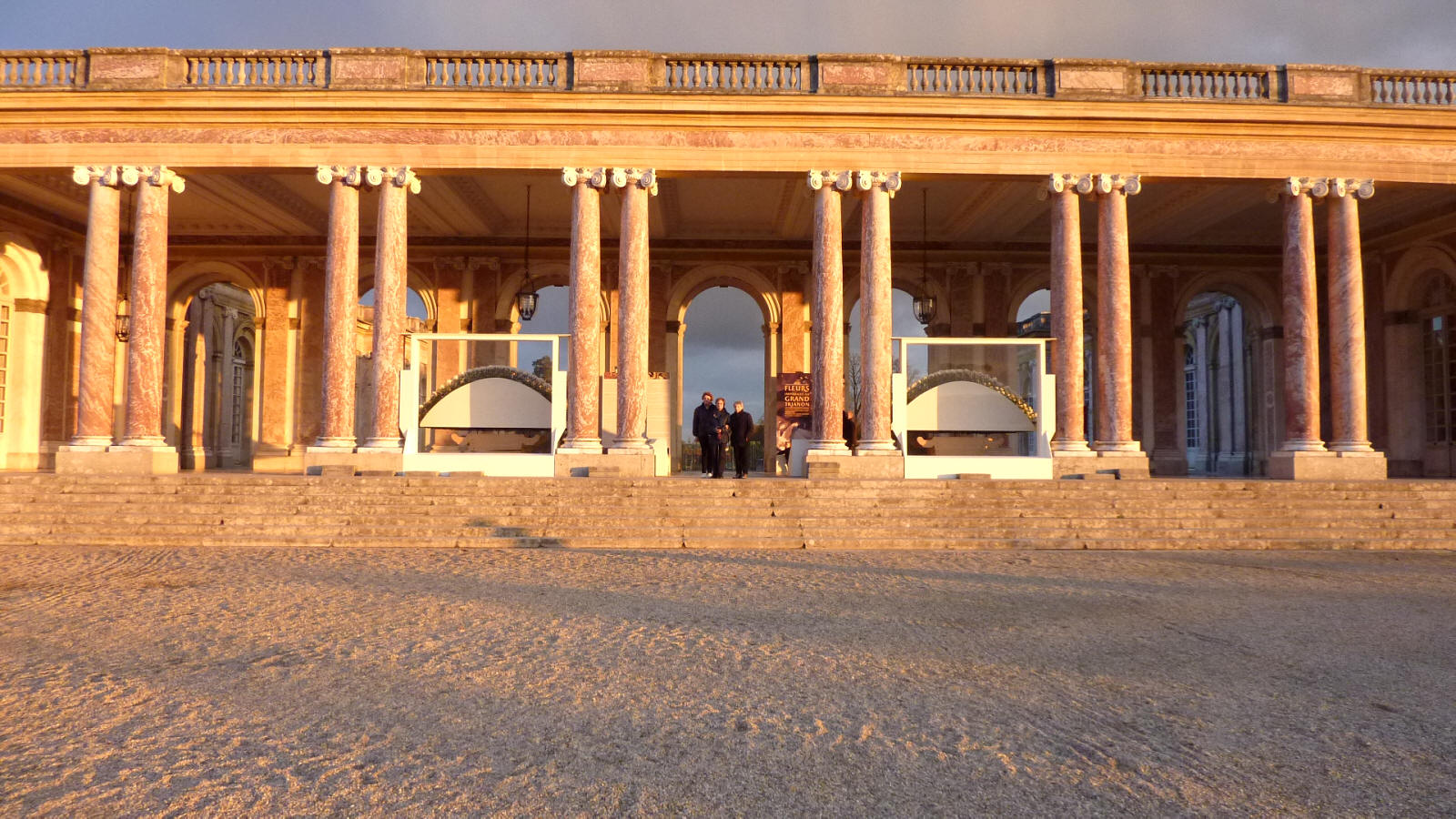 le péristyle du Grand Trianon le 4 novembre 2014 au coucher du soleil coté jardin (maj: 25/07/2015) (exposition de 2 chrysanthèmes japonais -ozukuri)